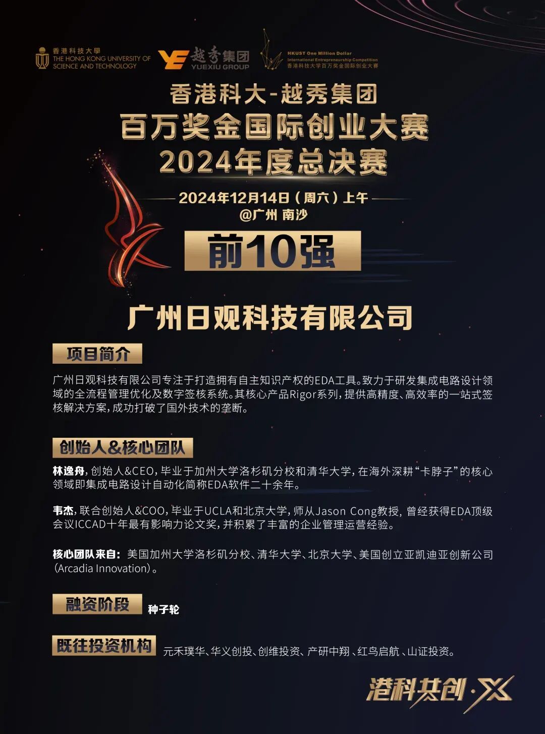 日观芯设广州分公司 — 日观科技荣获2024年度“香港科大—越秀集团”国际创业大赛前10强发表时间:2024-12-16 14:45 本次大赛集结了来自2024年全国五大赛区(北京、广州、佛山、深圳、香港)的1164支项目。专业评委团从技术高度、市场潜力、团队实力等角度对参赛项目进行专业评审,经过激烈角逐,最终评选出2024年度前10强入围总决赛。 广州日观科技荣获年度前10强 广州日观科技有限公司参与本次大赛的角逐,公司凭借技术核心竞争力、创业背景以及行业优势在一众参赛选手中脱颖而出,荣获2024年度“香港科大—越秀集团”国际创业大赛前10强。公司专注于打造拥有自主知识产权的EDA工具。致力于研发集成电路设计领域的全流程管理优化及数字签核系统。其核心产品Rigor系列,提供高精度、高效率的一站式签核解决方案,成功打破了国外技术的垄断。 ![]() 广州日观科技COO韦杰先生现场Road Show